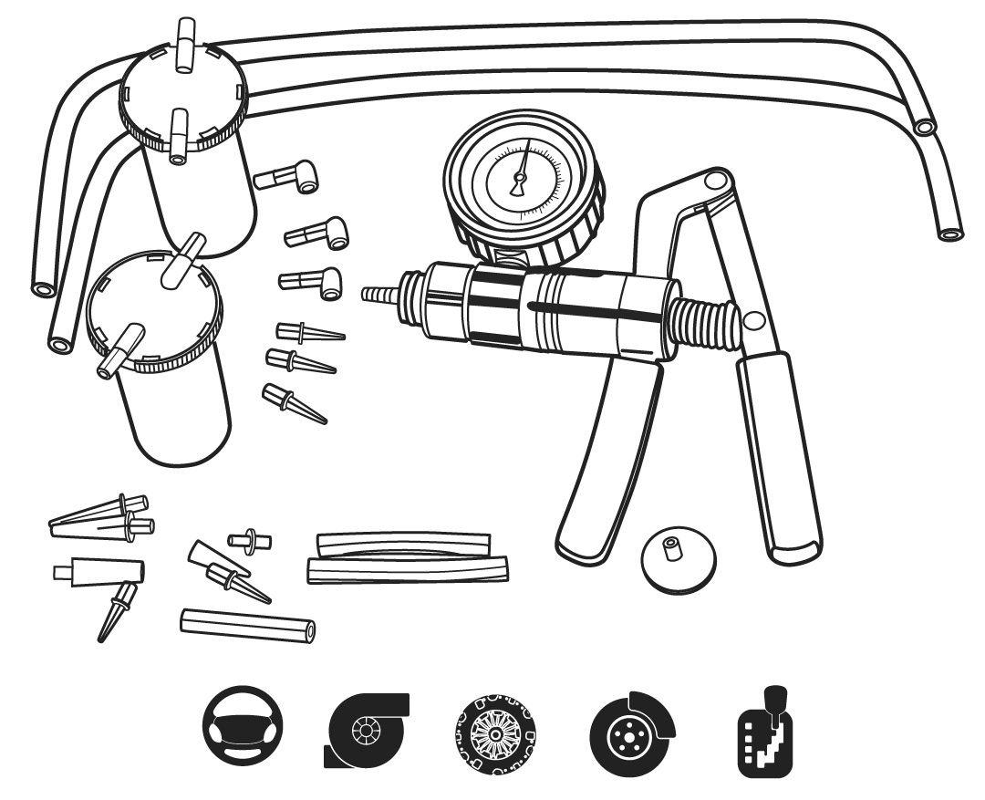 Комплект системи тиску/вакууму NEO призначений для видалення повітря з гальмівних систем, а також систем зчеплення та гідропідсилювача керма. Набір також стане в нагоді для перевірки вакуумних датчиків, клапана рециркуляції відпрацьованих газів, дросельної заслінки, регулятора тиску палива, модулятора тиску в автоматичних коробках передач. Бачки, шланги та перехідники для продувки гальмівної системи та зчеплення в комплекті. Манометр з робочим діапазоном від -1 до 3 бар. Комплект упакований в чохол для перенесення.
