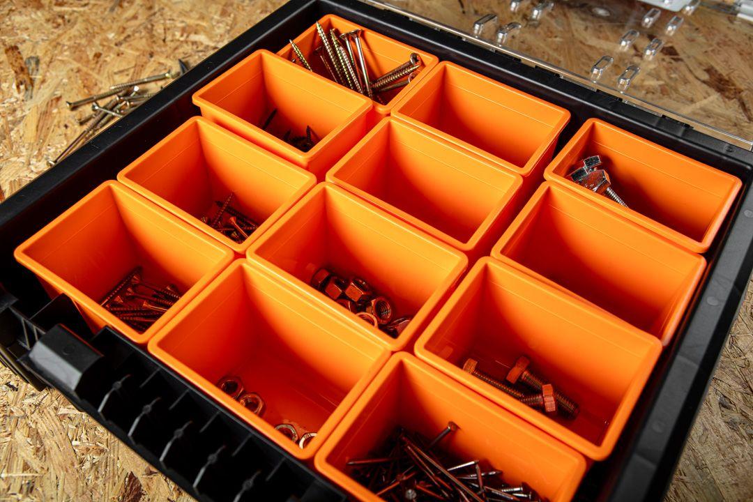 Органайзер «мікс» розмірами 40 x 40 x 12 см. Корисний і дуже практичний, він знайде застосування у будь-якій майстерні. Дозволяє з комфортом зберігати й транспортувати інструменти. Виготовлений із пластику або металу. Має 8 контейнерів і 17 регульованих перегородок, які спрощують упорядкування продуктів. Обладнаний алюмінієвими клямками й протиударними наріжними накладками, завдяки яким розміщені всередині інструменти не зламаються. Кришка органайзера, яка відрізняється міцністю, виготовлена з полікарбонату. Органайзер-касетниця NEOМарка NEO відповідає очікуванням професіоналів.
